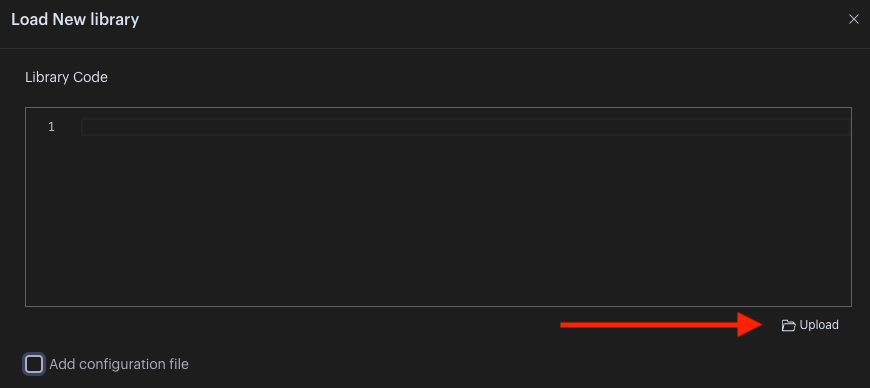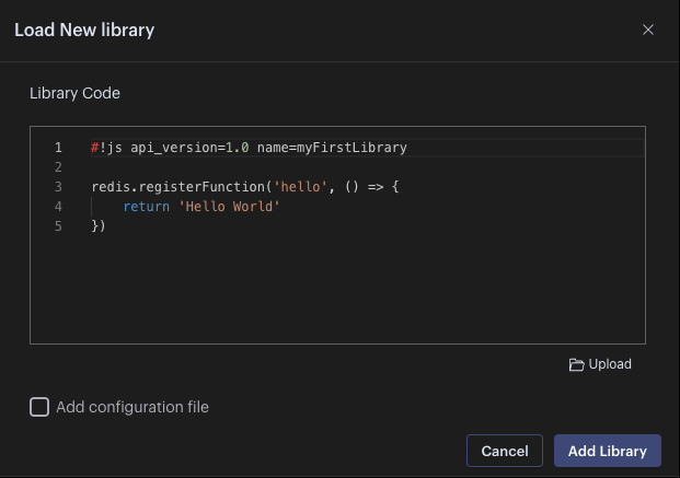 Click on the + Add Library button as before and, instead of adding the code directly into the editor, click on the Upload button, select the file from your file browser, and then click on Add Library. The file needs to contain the header, which contains the engine identifier, the API version, and the library name: #!js api_version=1.0 name=myFirstLibrary.