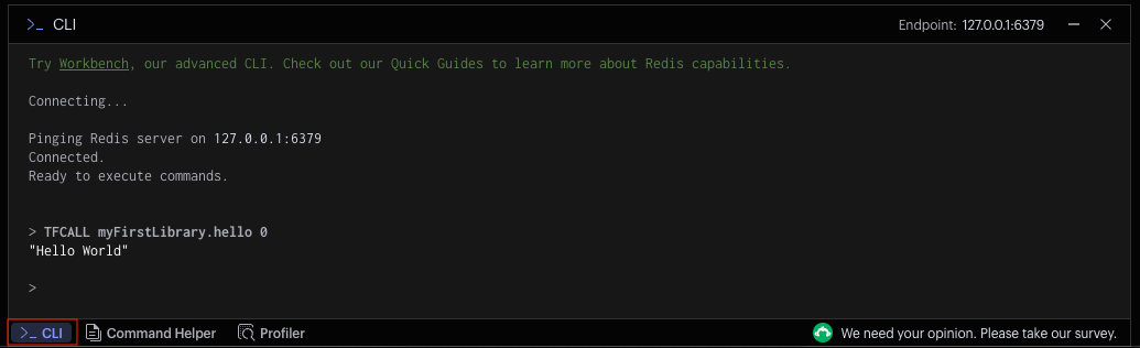 The TFCALL command is used to execute the JavaScript Function. If the command fails, an error will be returned. Click on the >_ CLI button in the lower left-hand corner to open a console window and then run the command shown below.