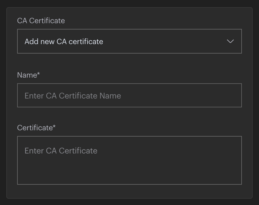 Select Use TLS. In the CA Certificate section, select Add new CA certificate. Give the certificate a name in the Name field, and enter the contents of