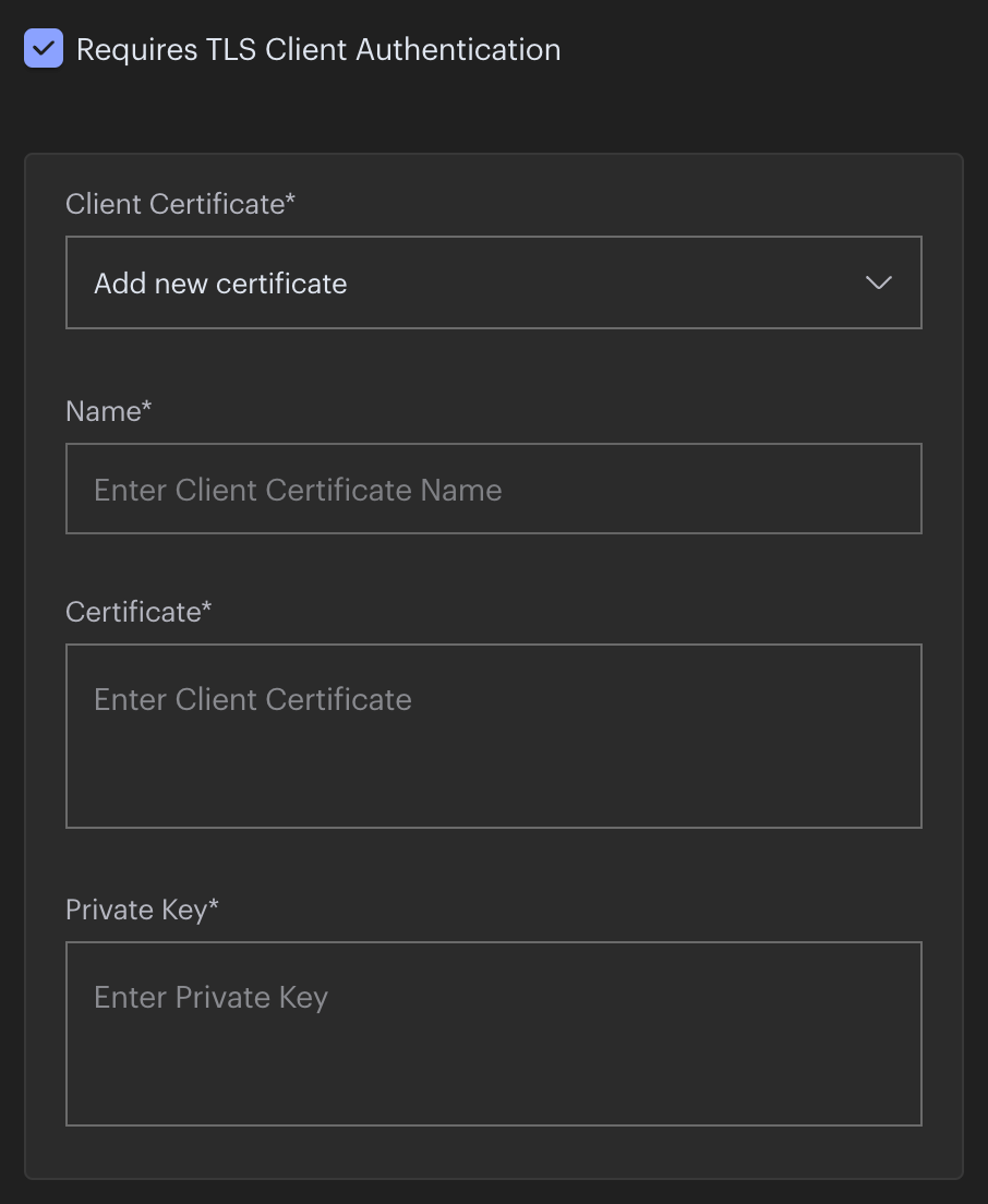 Select Requires TLS Client Authentication. In the Client Certificate section, select Add new certificate. Give the certificate a name in the Name field. Enter the contents of