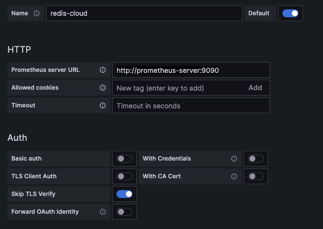 Once the Prometheus and Grafana Docker containers are running, and Prometheus is connected to your Redis Cloud subscription, you can set up your Grafana dashboards.