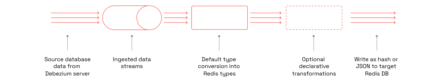 The key functionality that RDI performs is mapping the data coming from Debezium Server (representing a Source Database row data or row state change) into a Redis key with a value of Hash or JSON. There are two types of data transformations in RDI:
