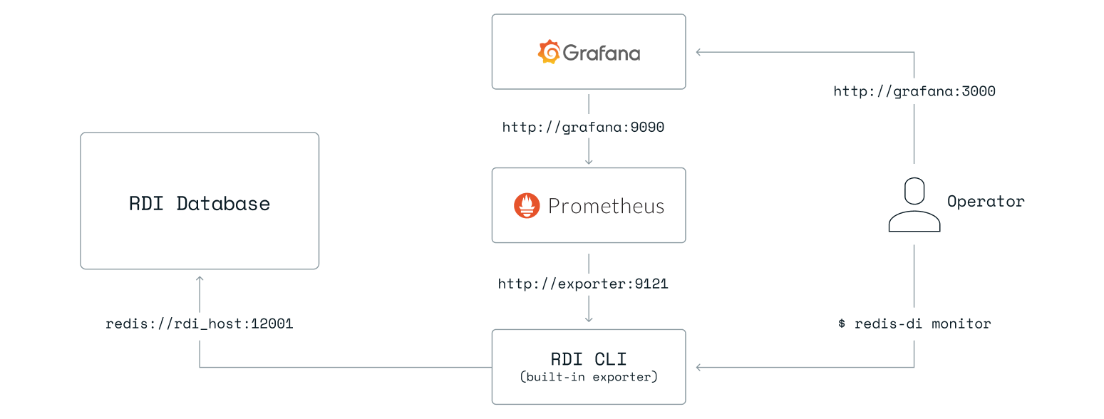 RDI allows collecting and exporting its metrics to Prometheus and visualizing them in Grafana. Operator can start the built-in exporter using the redis-di monitor command. The diagram describes this flow and the components involved: