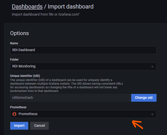 - On the next screen, select Upload JSON file and upload the file you downloaded in step 1. Make sure you select the data source that is connected to the RDI metrics exporter: