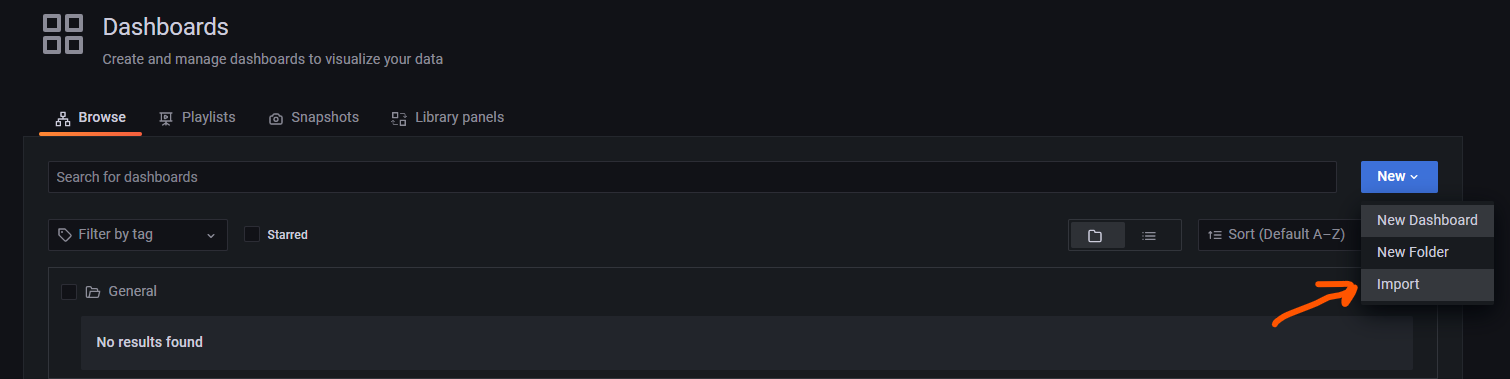 Log into Grafana and navigate to the list of dashboards, then choose New > Import: