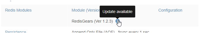 - From the admin console, go to your RDI configuration view (databases > Redis Data Integration > configuration). You should see an indication that there’s an update available for your RedisGears module: