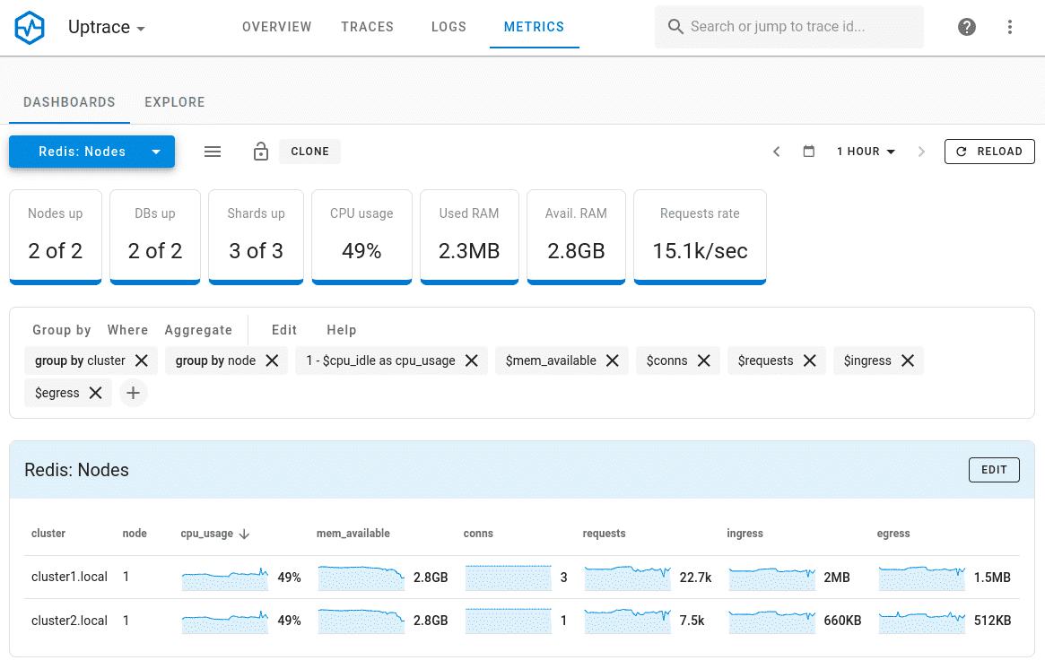 Because installing OpenTelemetry Collector and Uptrace can take some time, you can use the docker-compose example that also comes with Redis Enterprise cluster.