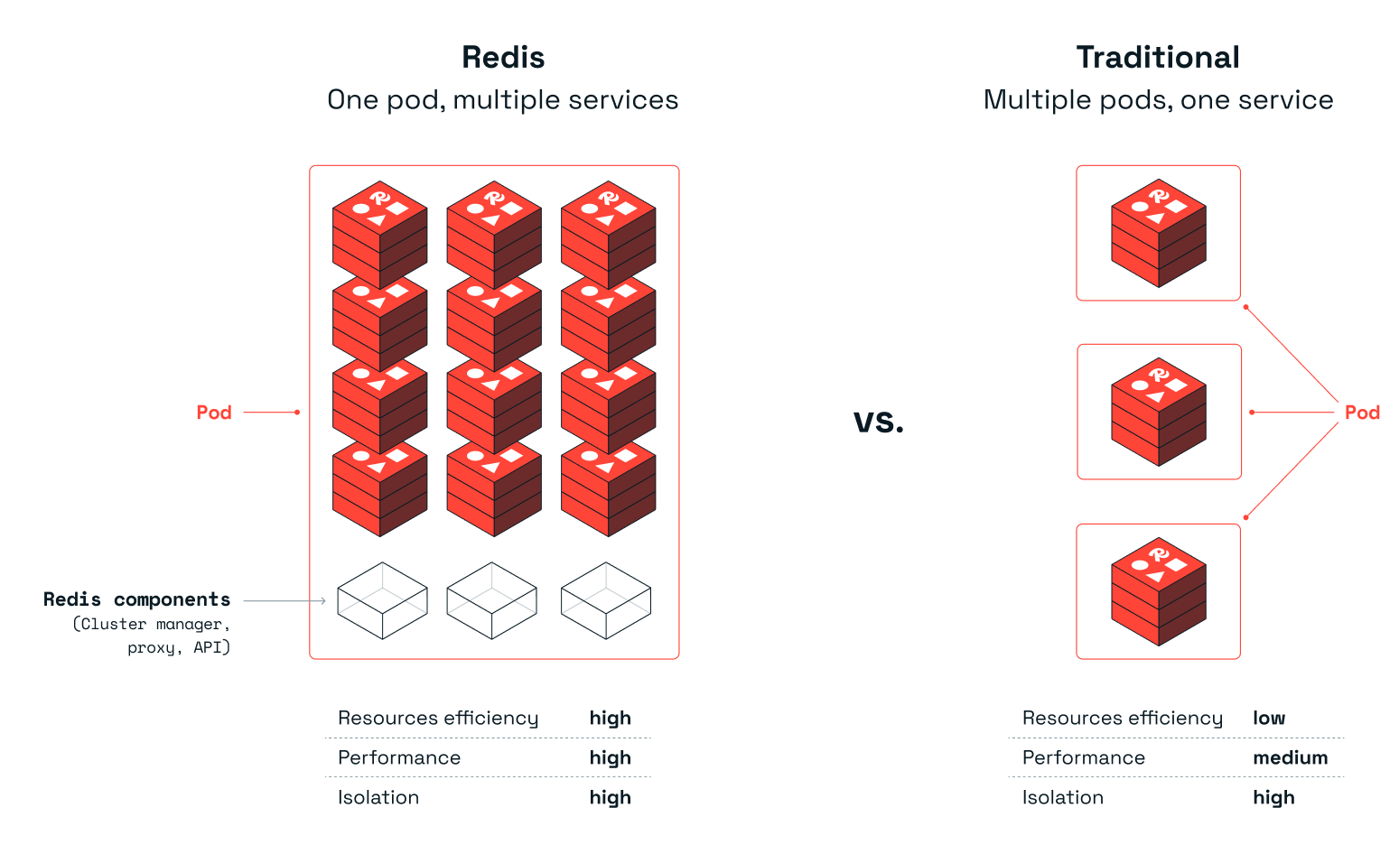 Each Pod includes multiple Redis Enterprise instances (multiple services). We found that the traditional method of deploying a Redis Enterprise database over Kubernetes, in which each Pod includes only a single Redis Enterprise instance while preserving a dedicated CPU, is notably inefficient. Redis Enterprise is exceptionally fast and in many cases can use just a fraction of the CPU resources to deliver the requested throughput. Furthermore, when running a Redis Enterprise Cluster with multiple Redis Enterprise instances across multiple Pods, the Kubernetes network, with its multiple vSwitches, can quickly become the deployment’s bottleneck. Therefore, Redis took a different approach to managing Redis Enterprise over the Kubernetes environment. Deploying multiple Redis Enterprise database instances on a single Pod allows us to better utilize the hardware resources used by the Pod such as CPU, memory, and network while keeping the same level of isolation. See the figure below: