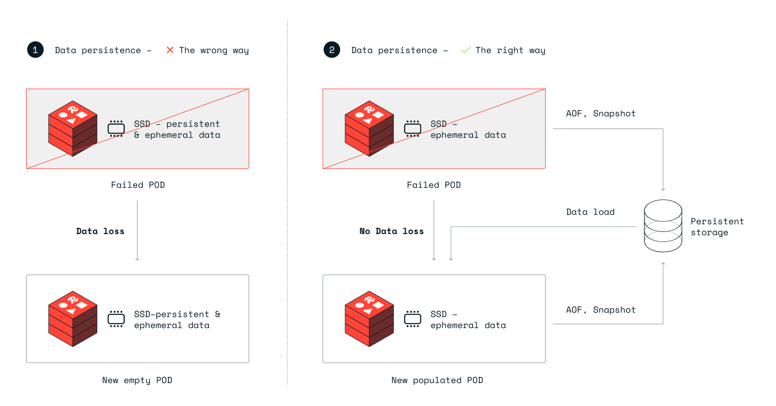 On the left-hand side (marked #1), Redis Enterprise uses local ephemeral storage for durability. When a Pod fails, Kubernetes launches another Pod as a replacement, but this Pod comes up with empty local ephemeral storage, and the data from the original Pod is now lost.