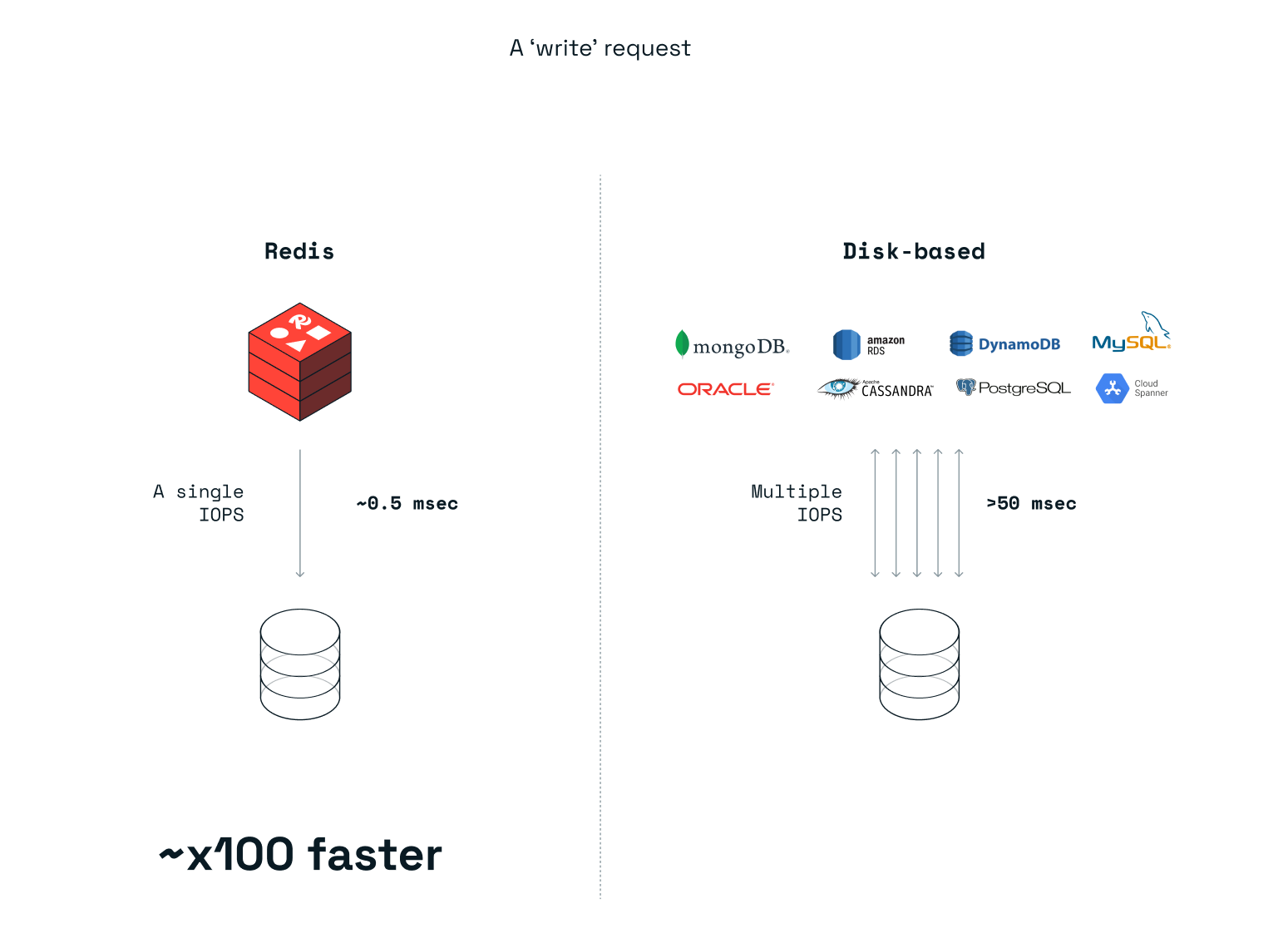 Redis Enterprise is not only great as an in-memory database but also extremely efficient in the way it uses persistent storage, even when the user chooses to configure Redis Enterprise to write every change to the disk. Compared to a disk-based database that requires multiple interactions (in most cases) with a storage device for every read or write operation, Redis Enterprise uses a single IOPS, in most cases, for a write operation and zero IOPS for a read operation. As a result, significant performance improvements are seen in typical Kubernetes environments, as illustrated in the figures below: