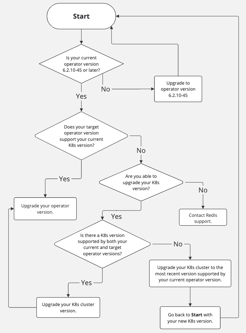 When upgrading, both your Kubernetes version and Redis operator version need to be supported at all times. When upgrading your Kubernetes version, you need to make sure both the current and target K8s version are supported by your Redis operator version. When upgrading your Redis operator version, you need make sure both the current and target operator versions are supported by your K8s version. This means if you are planning a large jump in versions, the upgrade might need to be done in multiple steps.