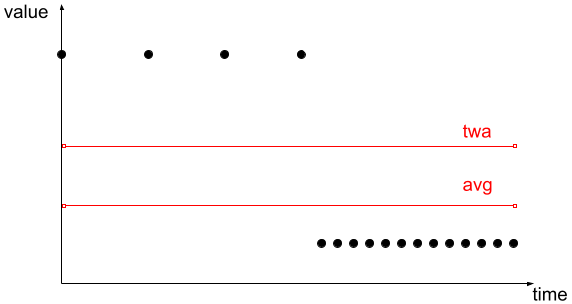avgto estimate the average value over a given timeframe would produce a good estimate only when the signal is sampled at constant intervals. If, however, samples are available at non-constant intervals (e.g., when some samples are missing), thetwaaggregator produces a more accurate estimate by averaging samples over time instead of simply averaging the samples.
