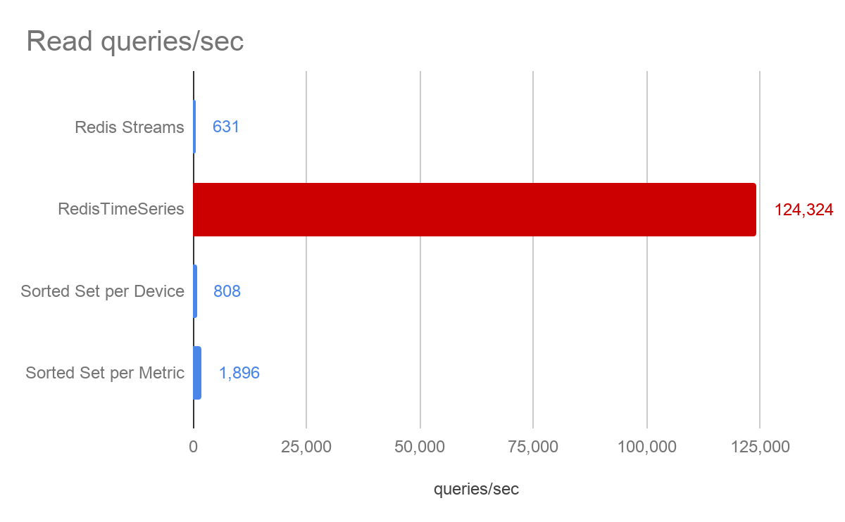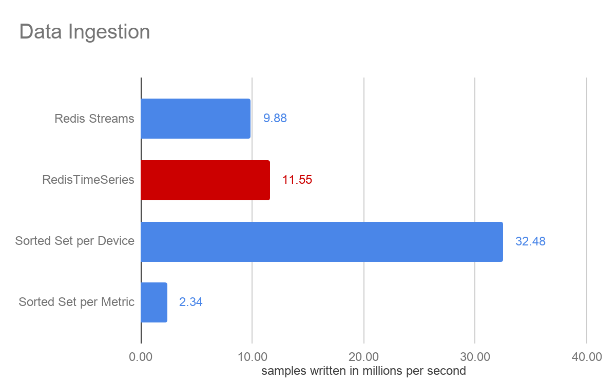 For both the Redis streams and sorted set approaches, the samples were stored as strings, while time series stored them as doubles. In this specific data set, we chose a CPU measurement with rounded integer values between 0-100, which thus consumes two bytes of memory as a string. With time series, each metric had 64-bit precision.