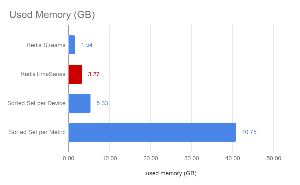 Time series can dramatically reduce the memory consumption when compared against both sorted set approaches. Given the unbounded nature of time series data, this is typically a critical criteria to evaluate - the overall data set size that needs to be retained in memory. Redis streams reduces the memory consumption further but would be equal or higher than time series when more digits for a higher precision would be required.