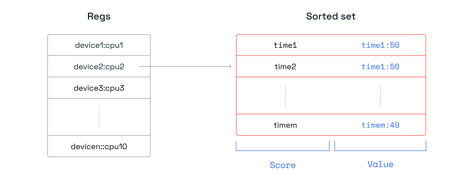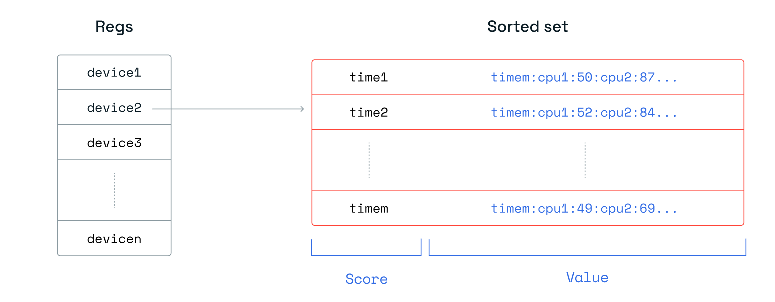 Another alternative approach would be to normalize the data by creating a hash with a unique key to track all measurements for a given device for a given timestamp. This key would then be the value in the sorted set. However, having to access many hashes to read a time series would come at a huge cost during read time, so we abandoned this path.
