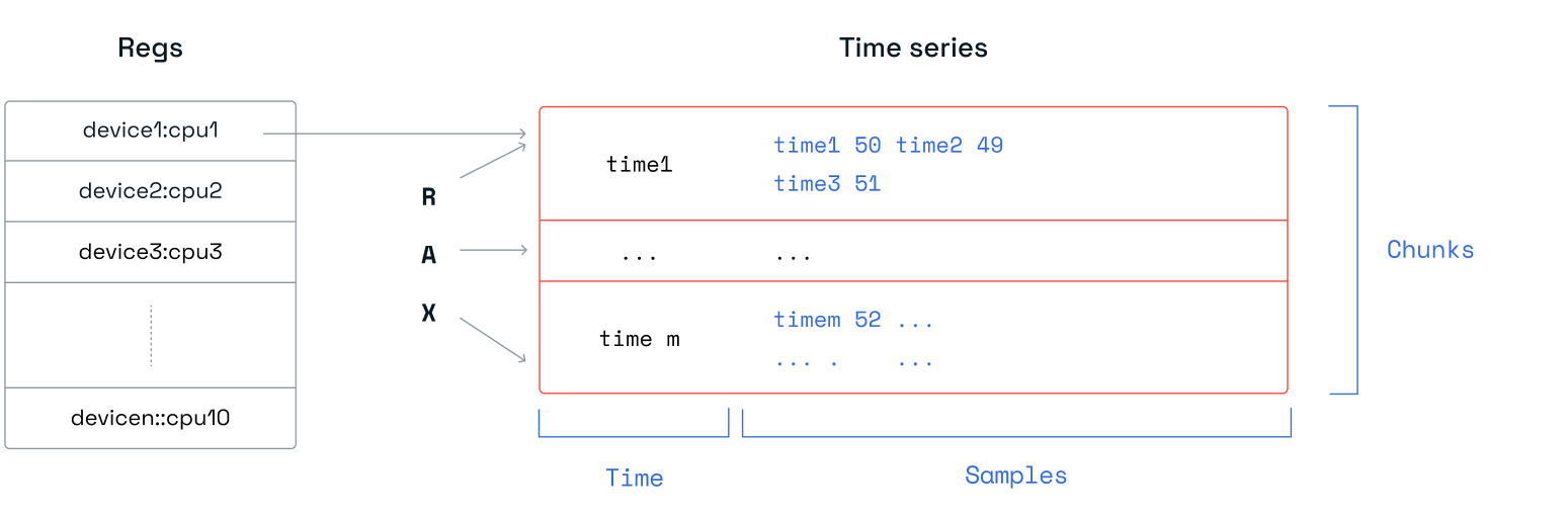 A time series is a linked list of memory chunks. Each chunk has a predefined size of samples. Each sample is a tuple of the time and the value of 128 bits, 64 bits for the timestamp and 64 bits for the value.