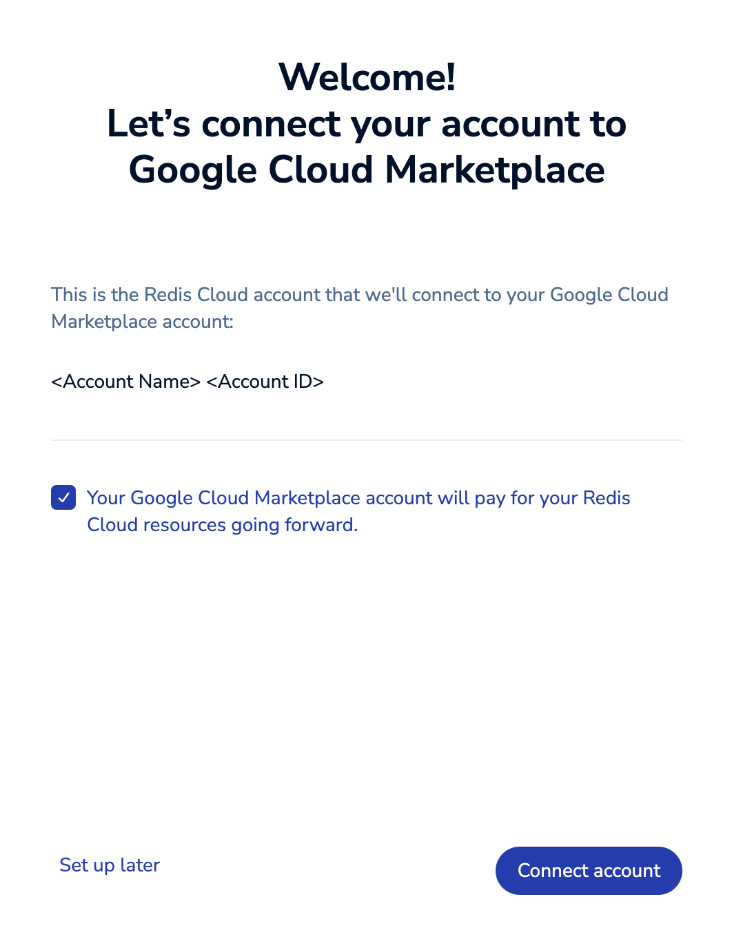 After you connect your Redis account to your Google Cloud Marketplace account, a message appears in the upper left corner of the account panel.