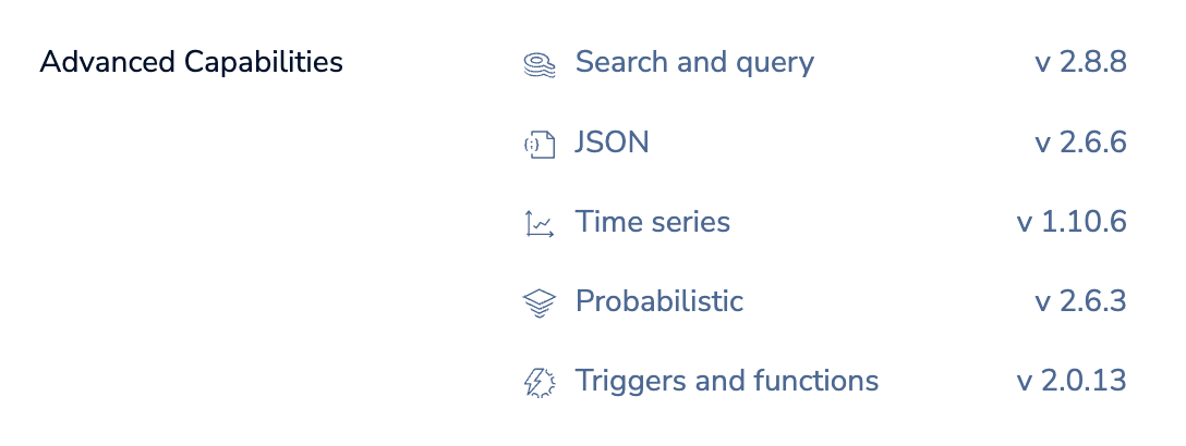 When the database Type is set to Redis Stack, the Advanced capabilities section of the database details page displays the advanced capabilities included with the database and their versions.