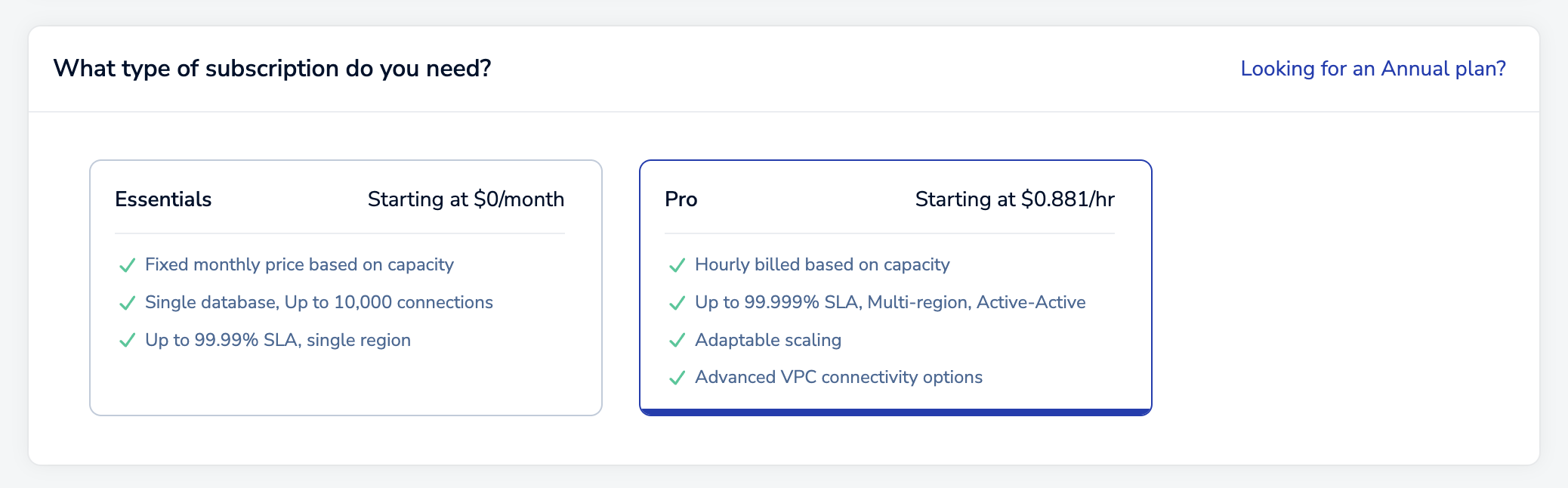 The Redis Billing Unit types associated with your Pro subscription depend on your database memory size and throughput requirements.