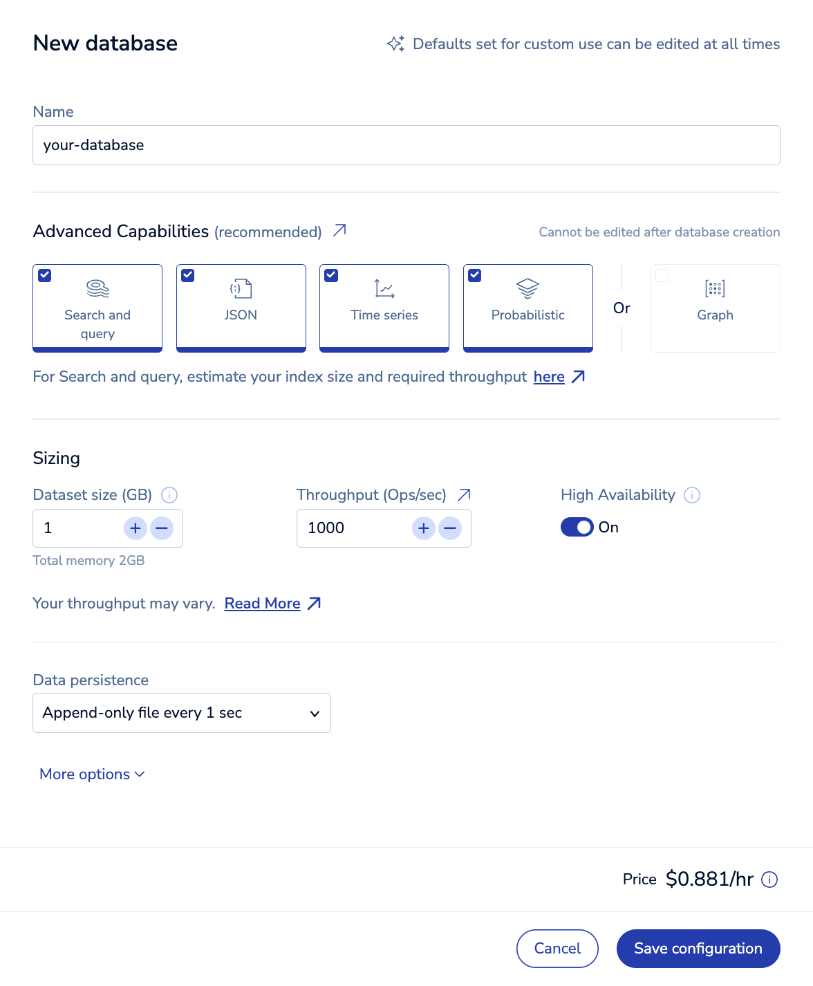 | Advanced Capabilities | Advanced data types used by the database. Choose from Search and query, JSON, Time series, Probabilistic, or Graph (EOL). |
