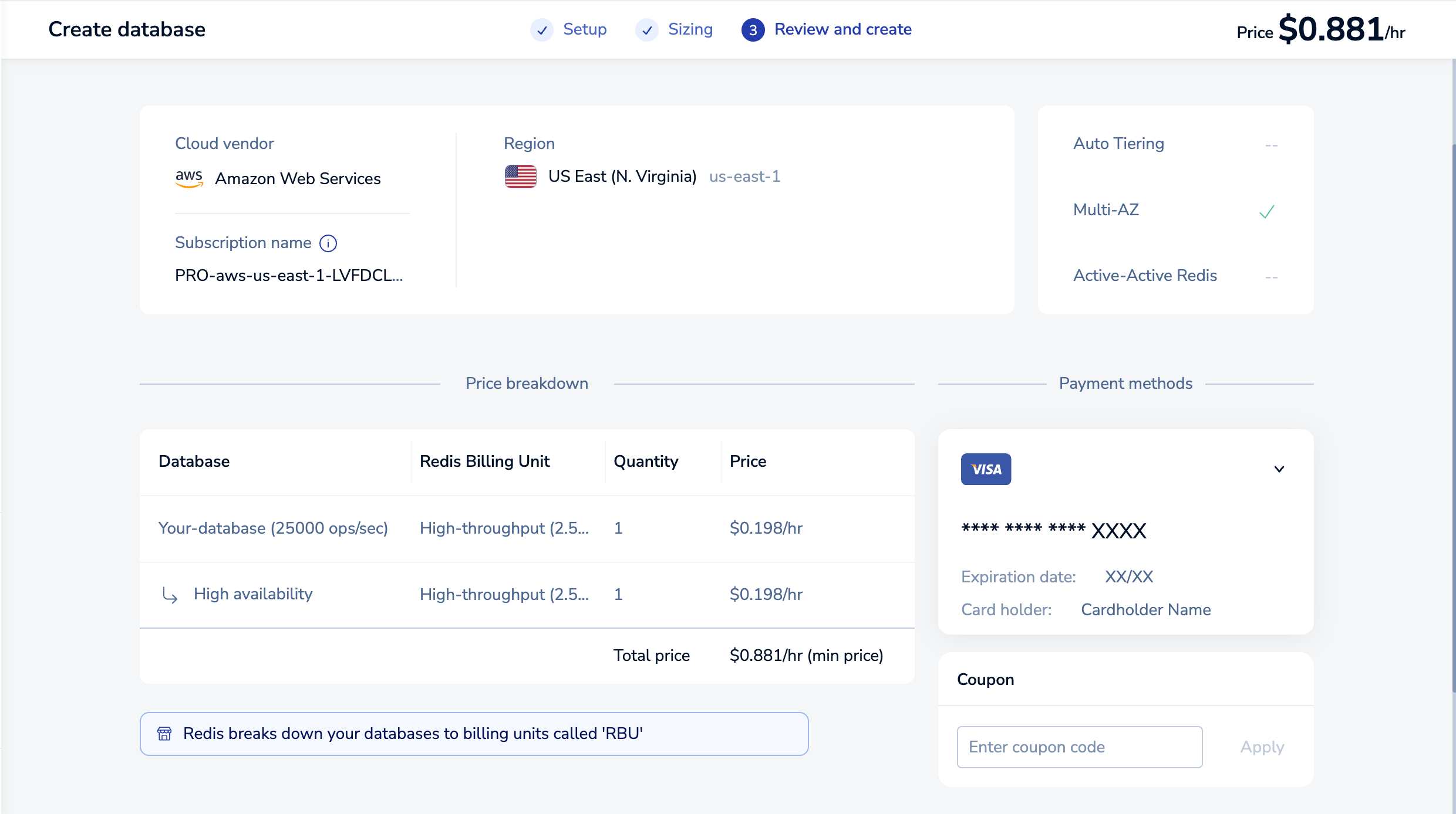 Select Back to Sizing to make changes or Confirm & Pay to create your databases.