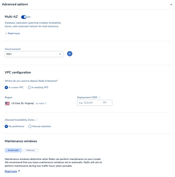 | Maintenance windows | Determines when Redis can perform maintenance on your databases. Select Manual if you want to set manual maintenance windows. |