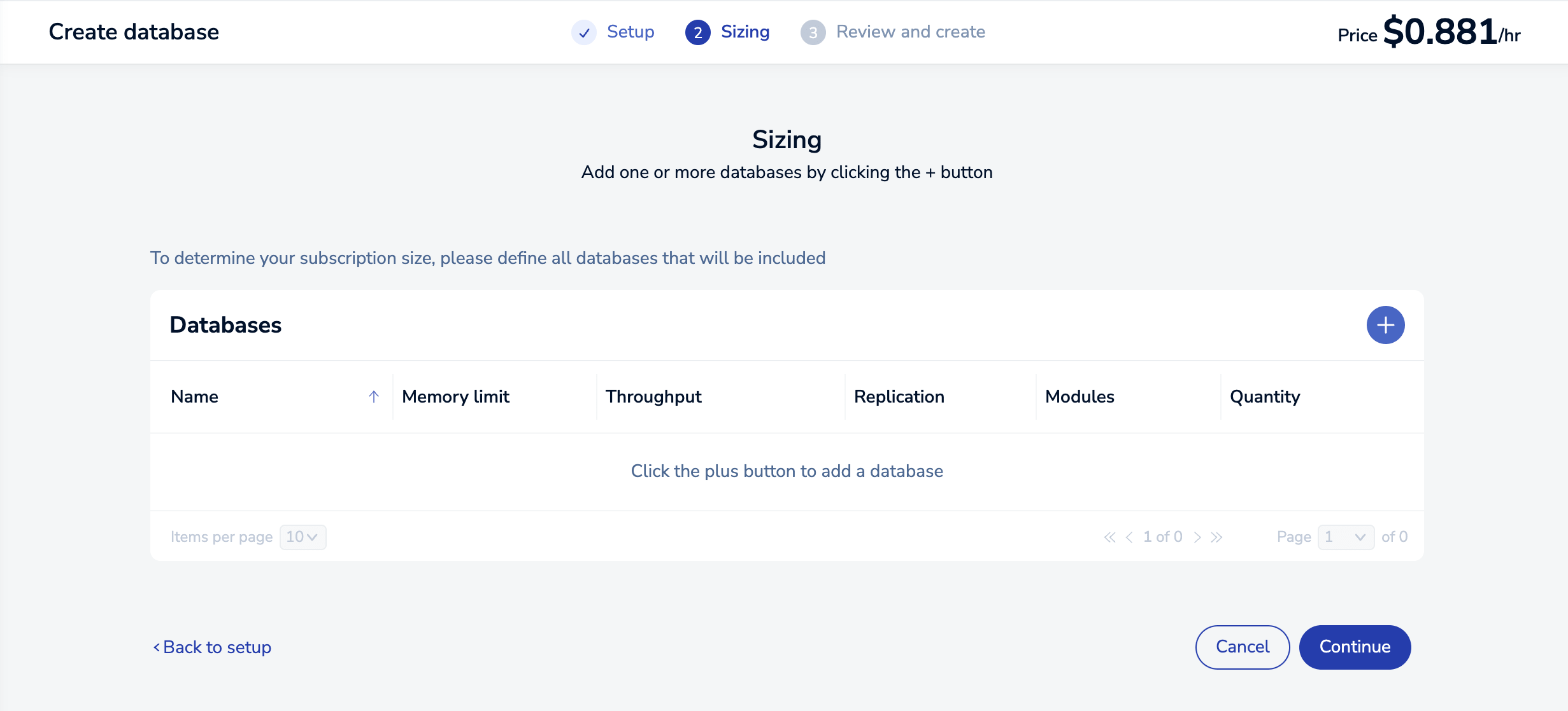 The Sizing tab helps you specify the database, memory, and throughput requirements for your subscription.