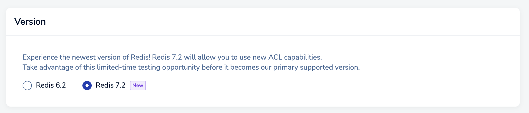 The Version section lets you choose the Redis version of your databases. Choose Redis 7.2 if you want to use the latest advanced features of Redis.