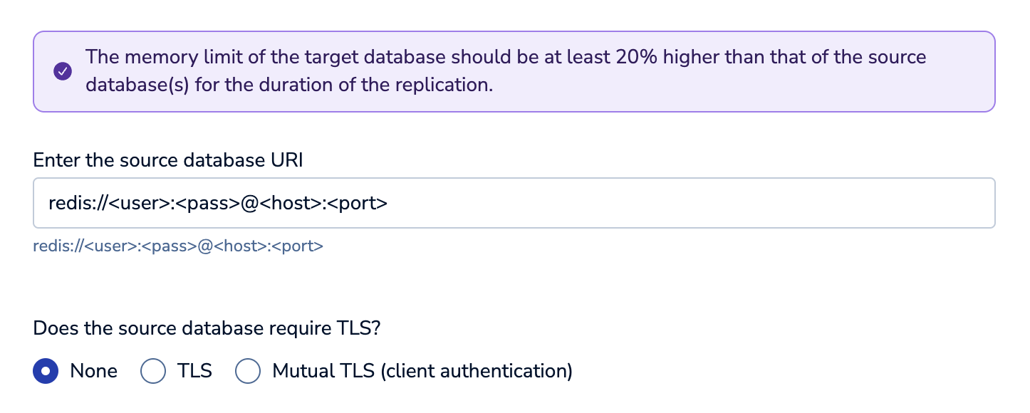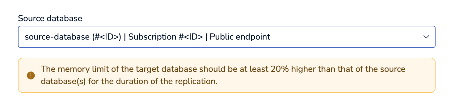 To illustrate, suppose you want to migrate a 1 GB source database without replication to a target database with replication enabled. Here, the target database memory limit should be at least 2.5 GB to avoid data loss.