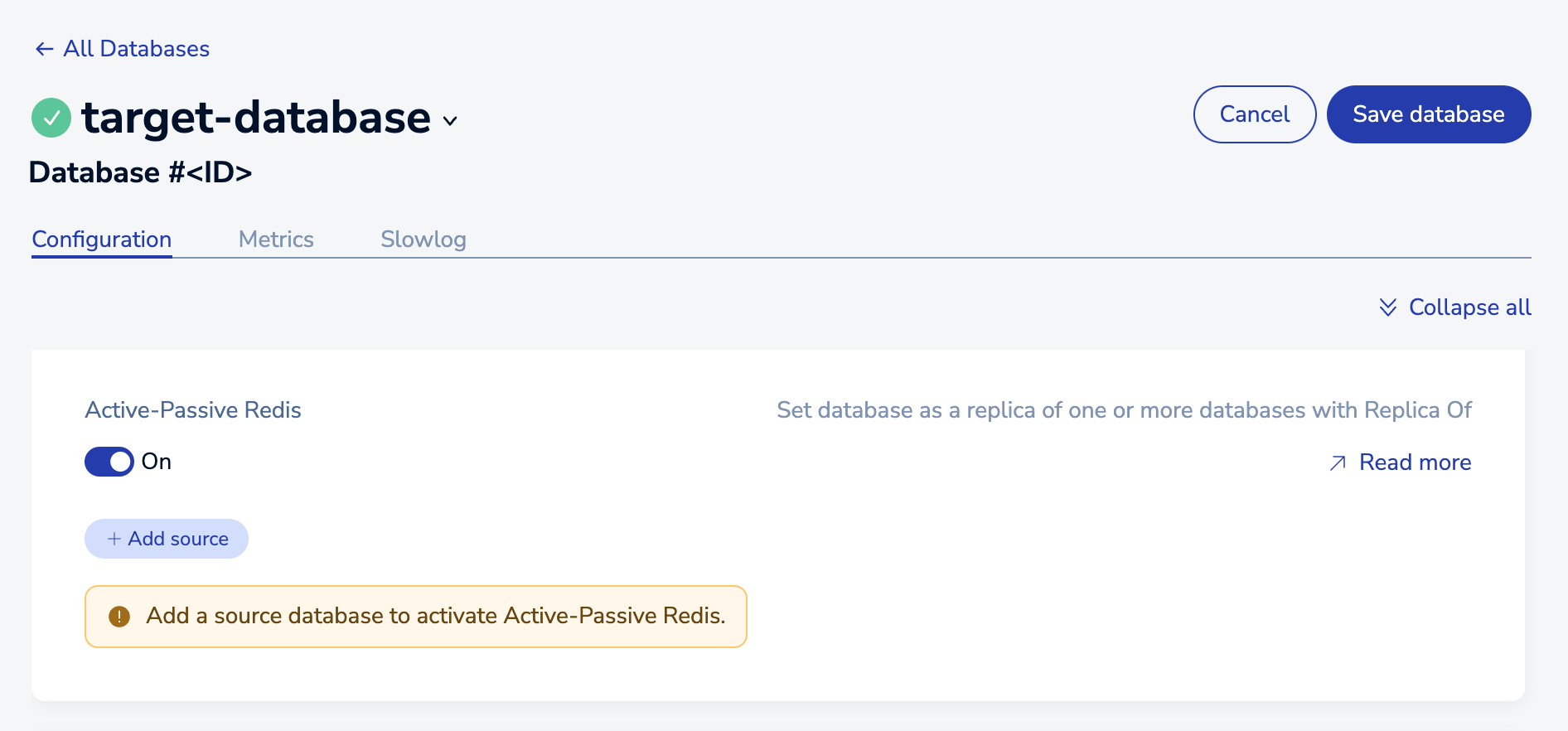 To migrate data using Active-Passive syncing, specify the target database as an Active-Passive replica of the source database: