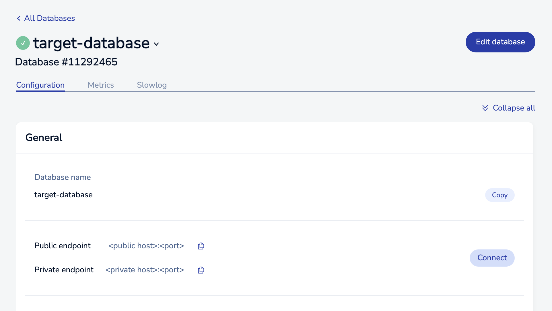 - Get the source database's public endpoint from the General section of the database's Configuration tab.