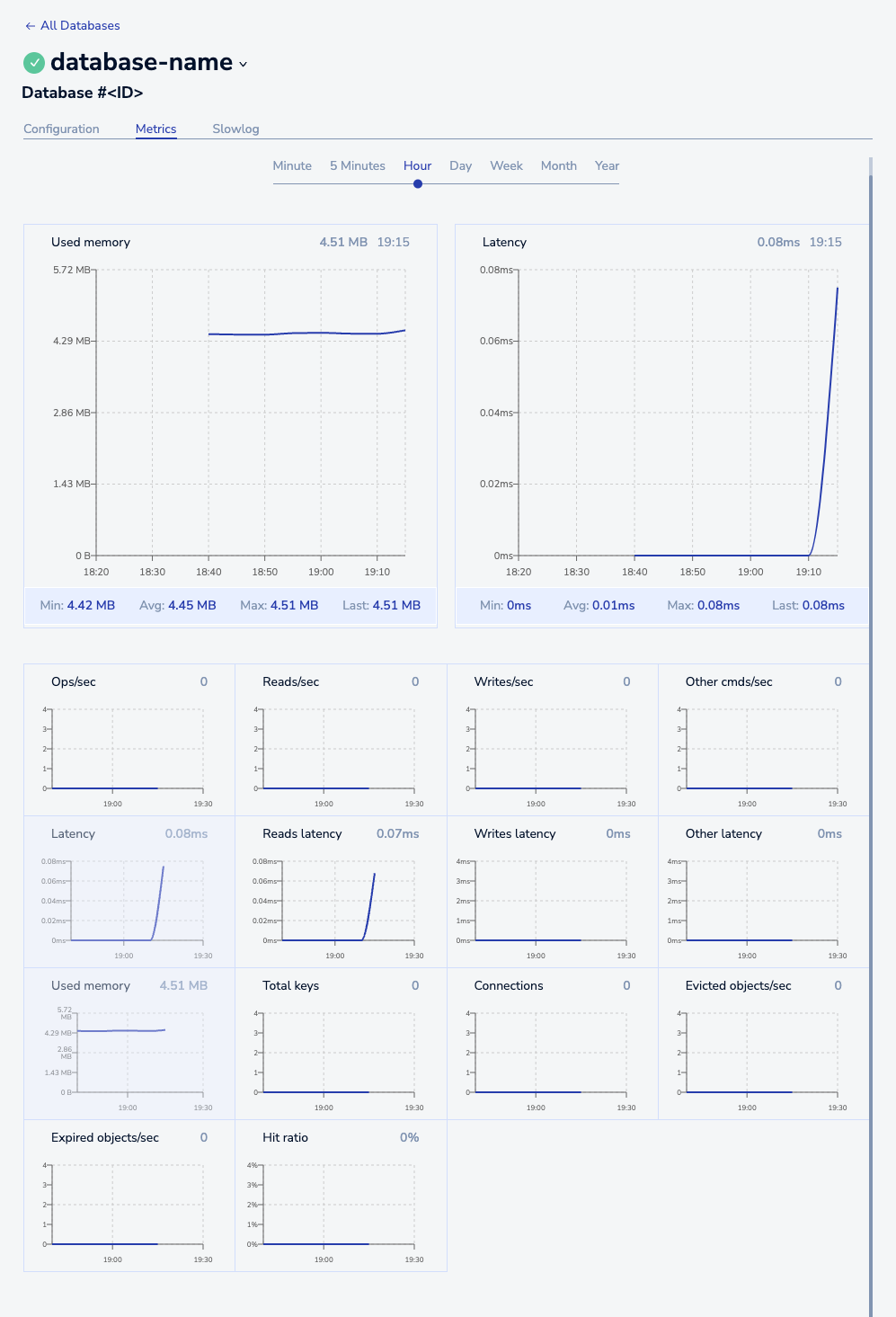 Redis Cloud provides a variety of metrics to help you monitor database performance. You can view graphs of performance data at any time and receive emails when performance crosses defined thresholds.