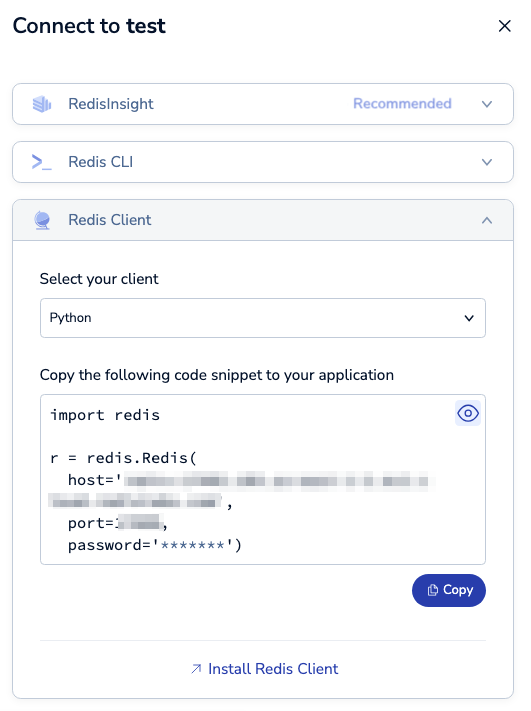 A Redis client is a software library or tool that enables applications to interact with a Redis server. Each client has its own syntax and installation process. For help with a specific client, see the client's documentation.