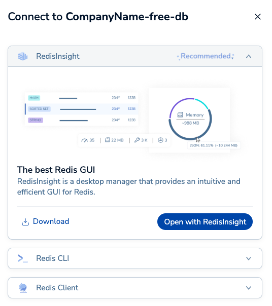 In the connection wizard, under Redis Insight, select Download to download Redis Insight.