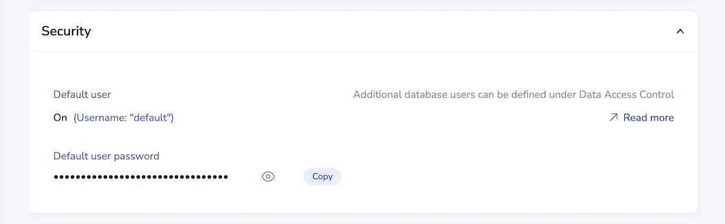 To connect to your database, you need your username and password. Each database is protected by a Default user called default and a masked Default user password. Select the eye icon to show or hide the password.