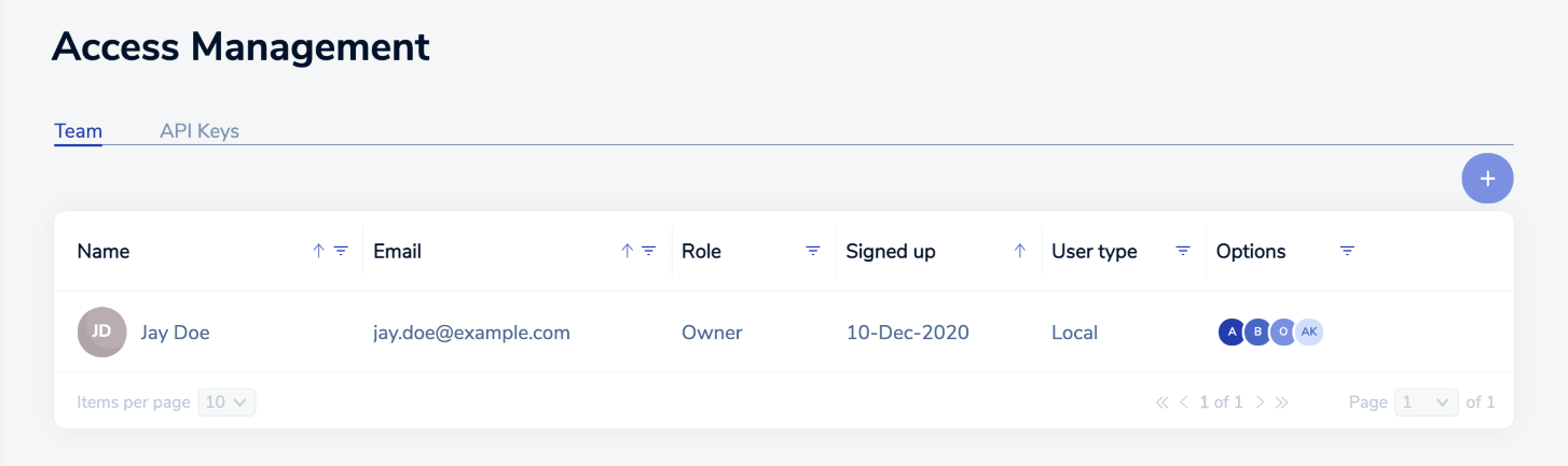 The Team tab lets you manage the people allowed to access your account. Each authorized person is assigned to a role that specifies their privileges.