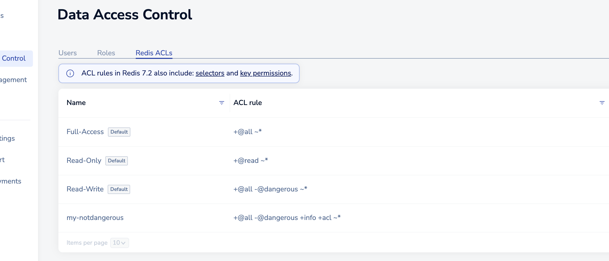 You can define custom Redis ACL rules to assign to a data access role or use predefined Redis ACLs.