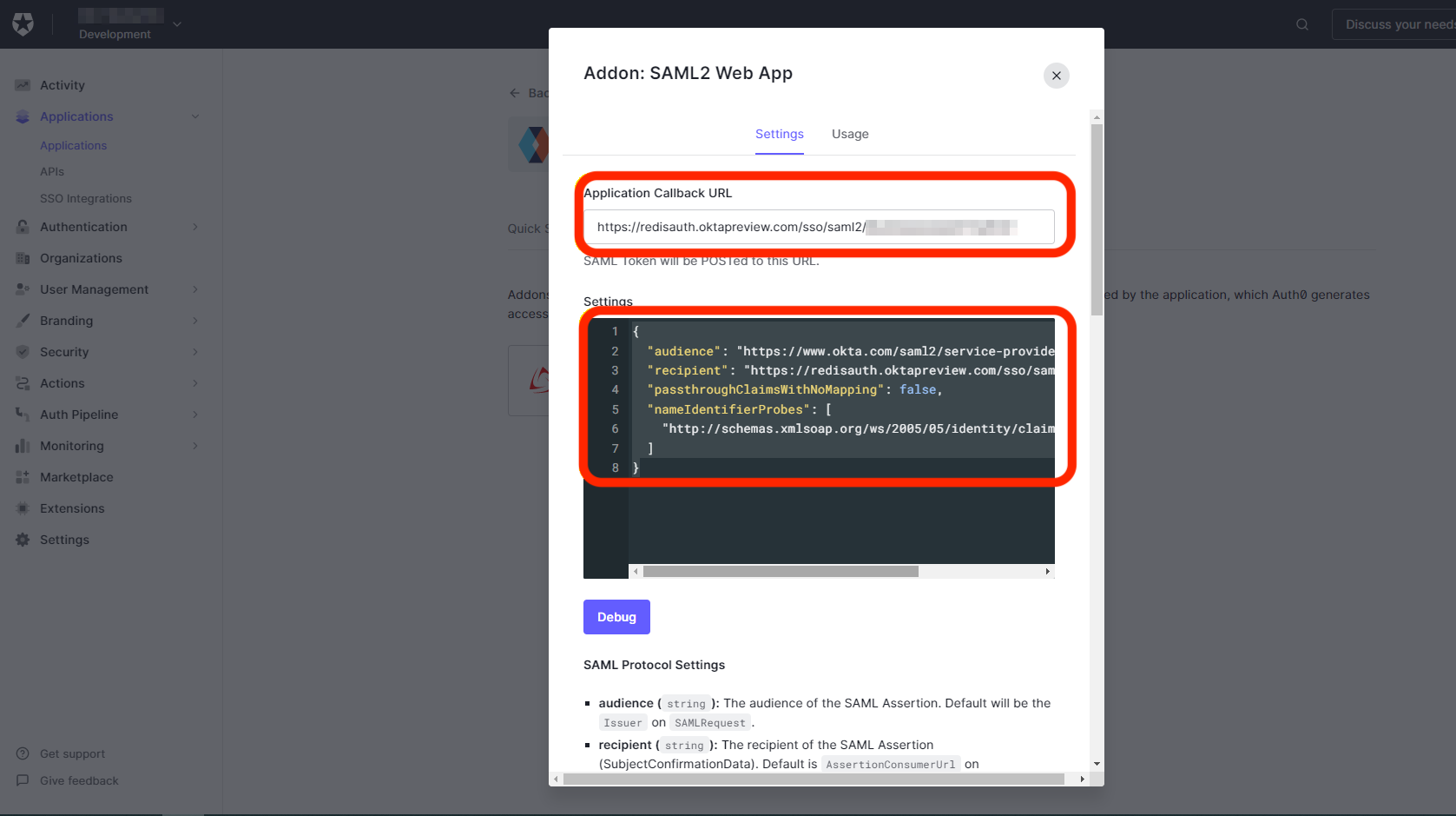 Return to the Auth0 SAML application and select Addons > Settings: