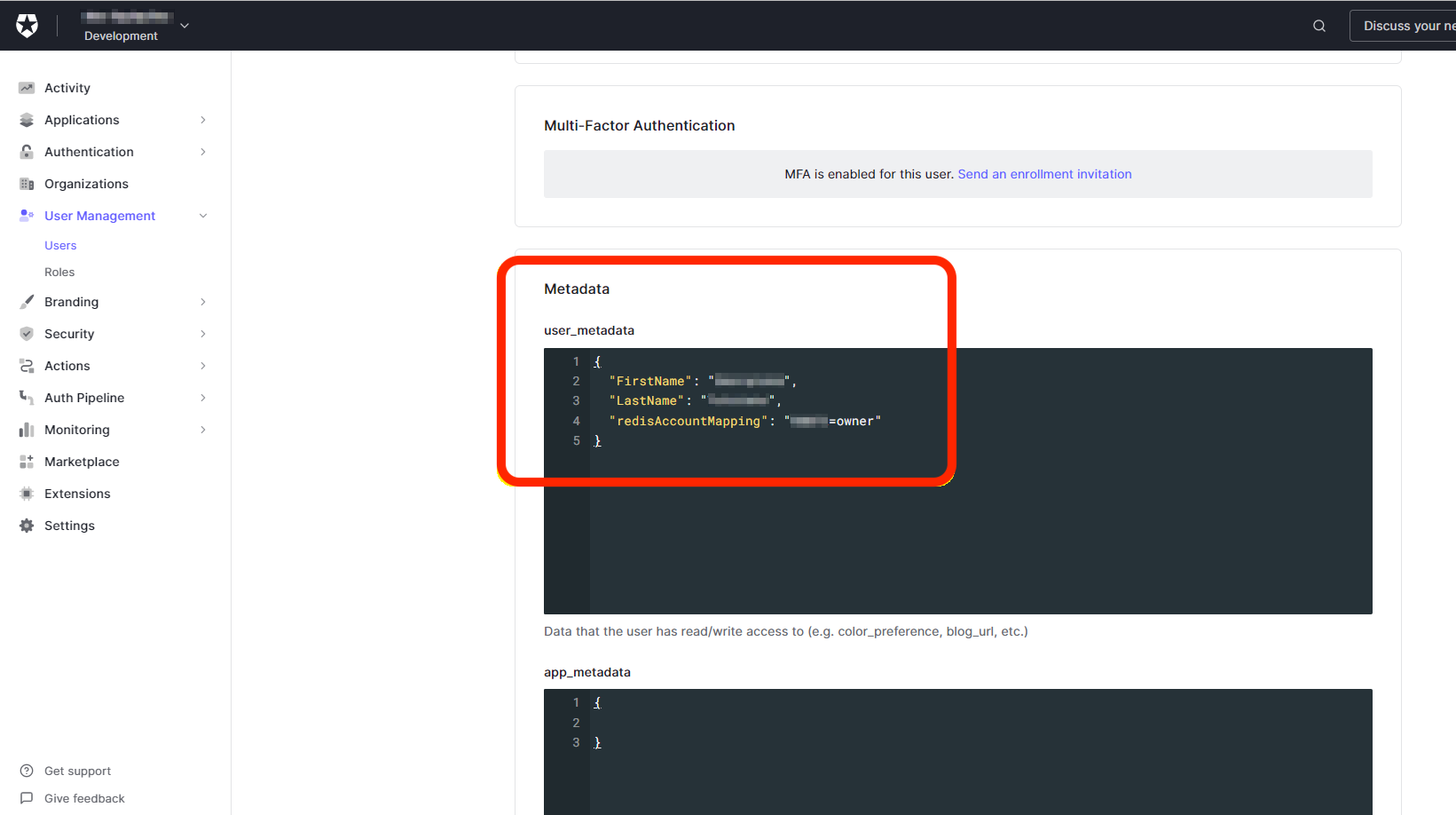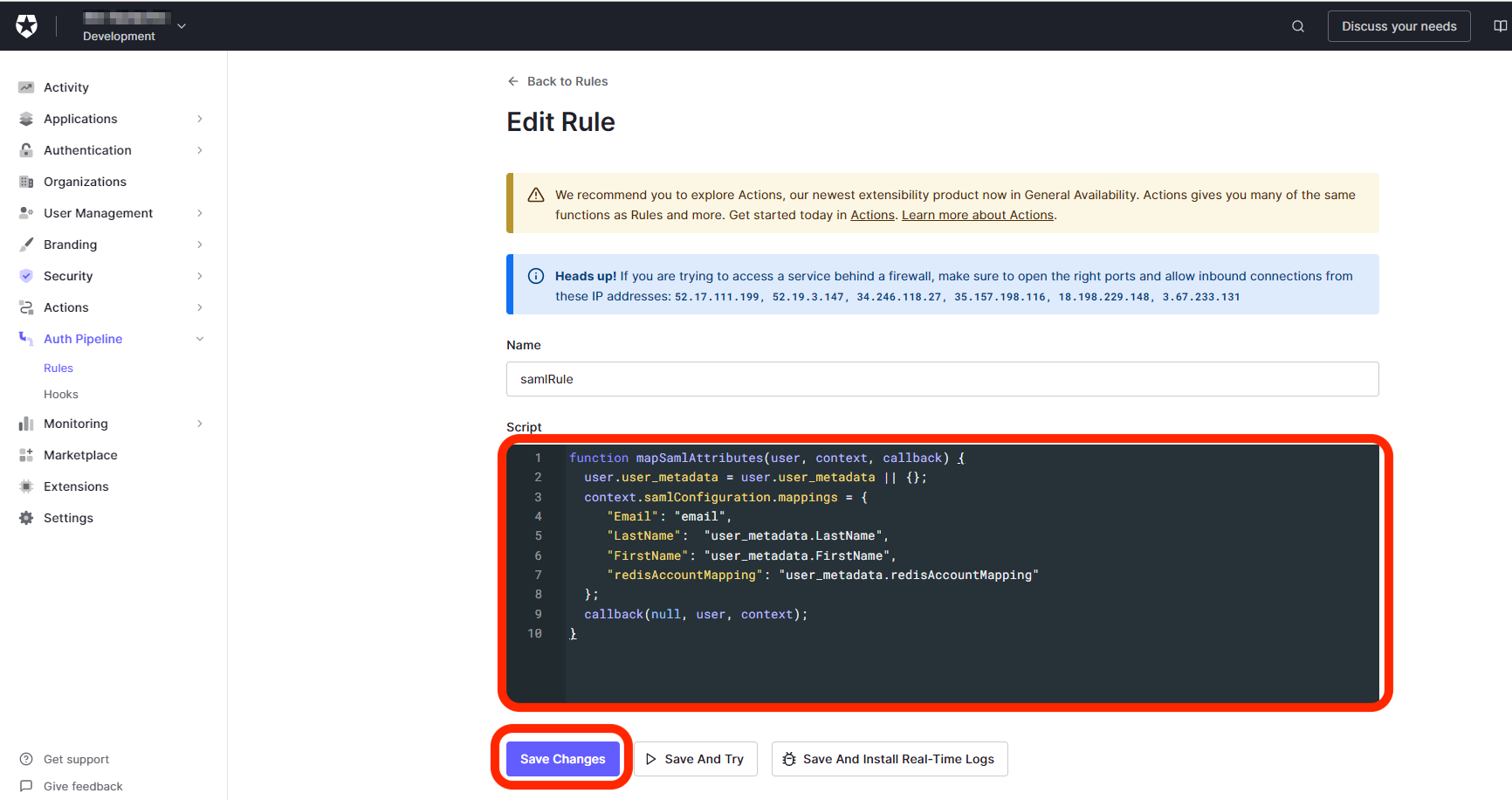 function mapSamlAttributes(user, context, callback) { user.user_metadata = user.user_metadata || {}; context.samlConfiguration.mappings = { "Email": "email", "LastName": "user_metadata.LastName", "FirstName": "user_metadata.FirstName", "redisAccountMapping": "user_metadata.redisAccountMapping" }; callback(null, user, context); } -
