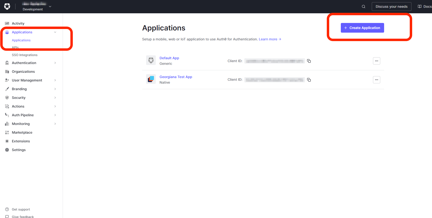 Open Applications > Applications and select Create Application.