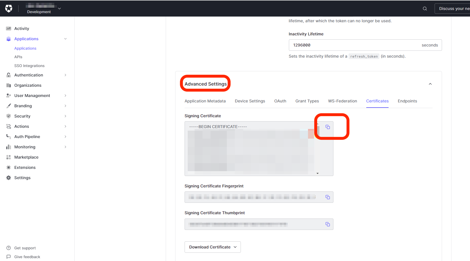 From the newly created application, go to Settings > Advanced Settings > Certificates.