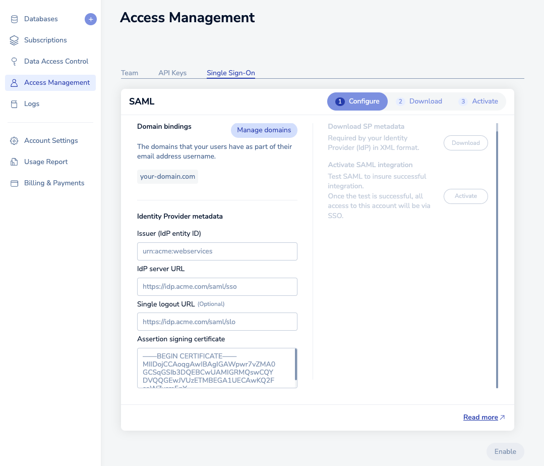Now that you have you Auth0 IdP server ready, configure support for SAML in Redis Cloud.