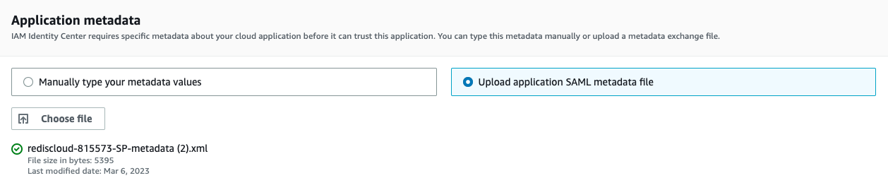 Return to the Configuration setup screen in IAM identity Center. Scroll down to the bottom of the page and select Upload application SAML metadata file. Select upload and choose the file that you downloaded in the SAML configuration screen in Redis Cloud.