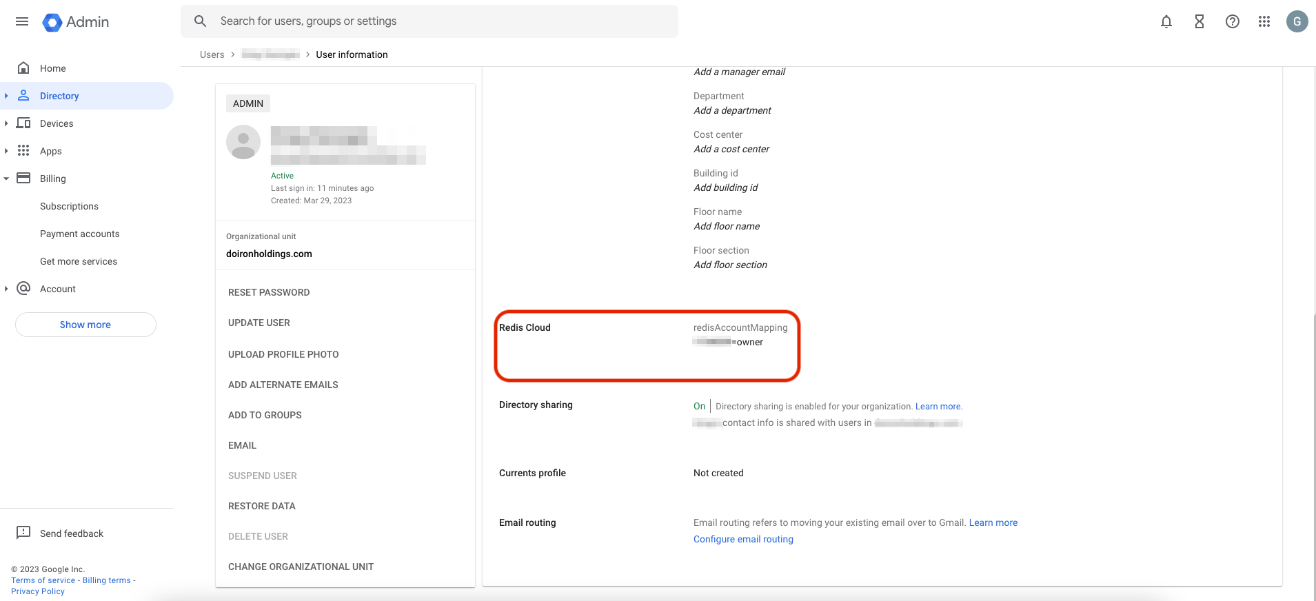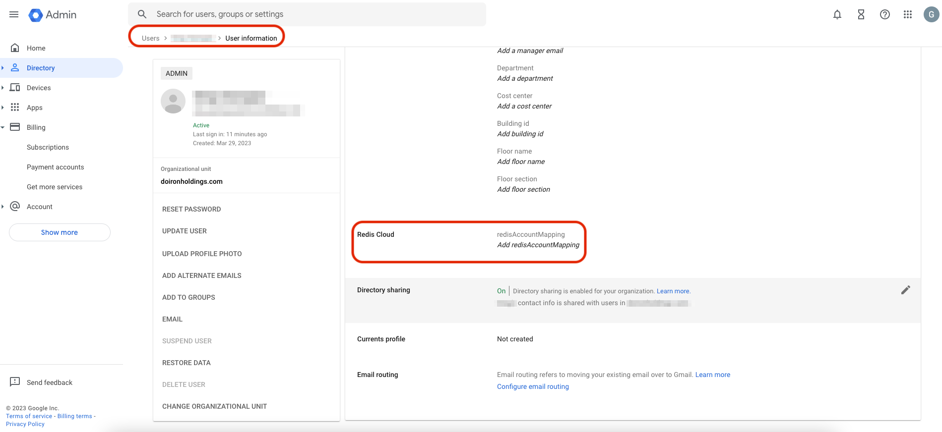 From the main menu in Google Workspace, select Directory then Users, then select the user you wish to configure.