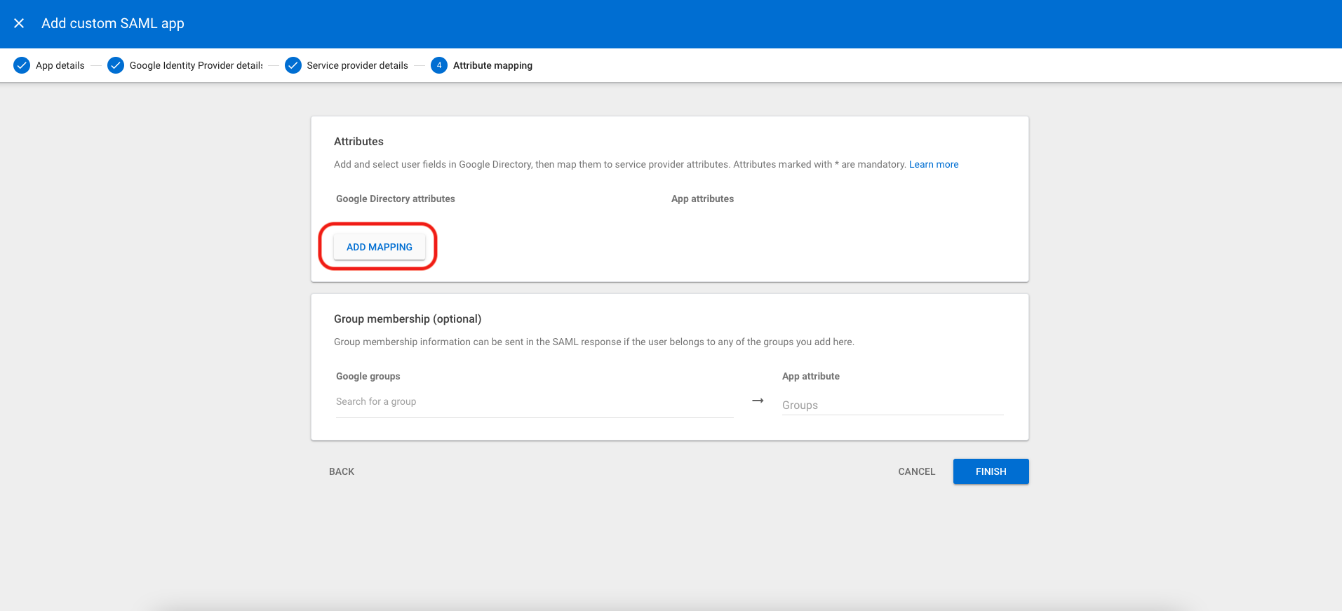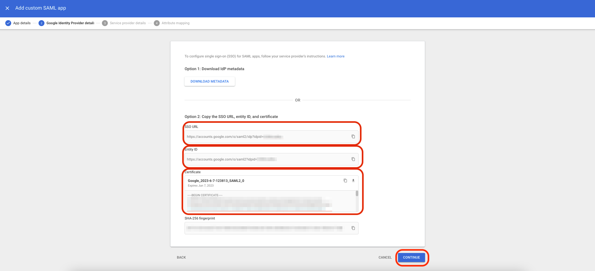 Return to the Service provider details screen in Google Workspace, and add the following information: