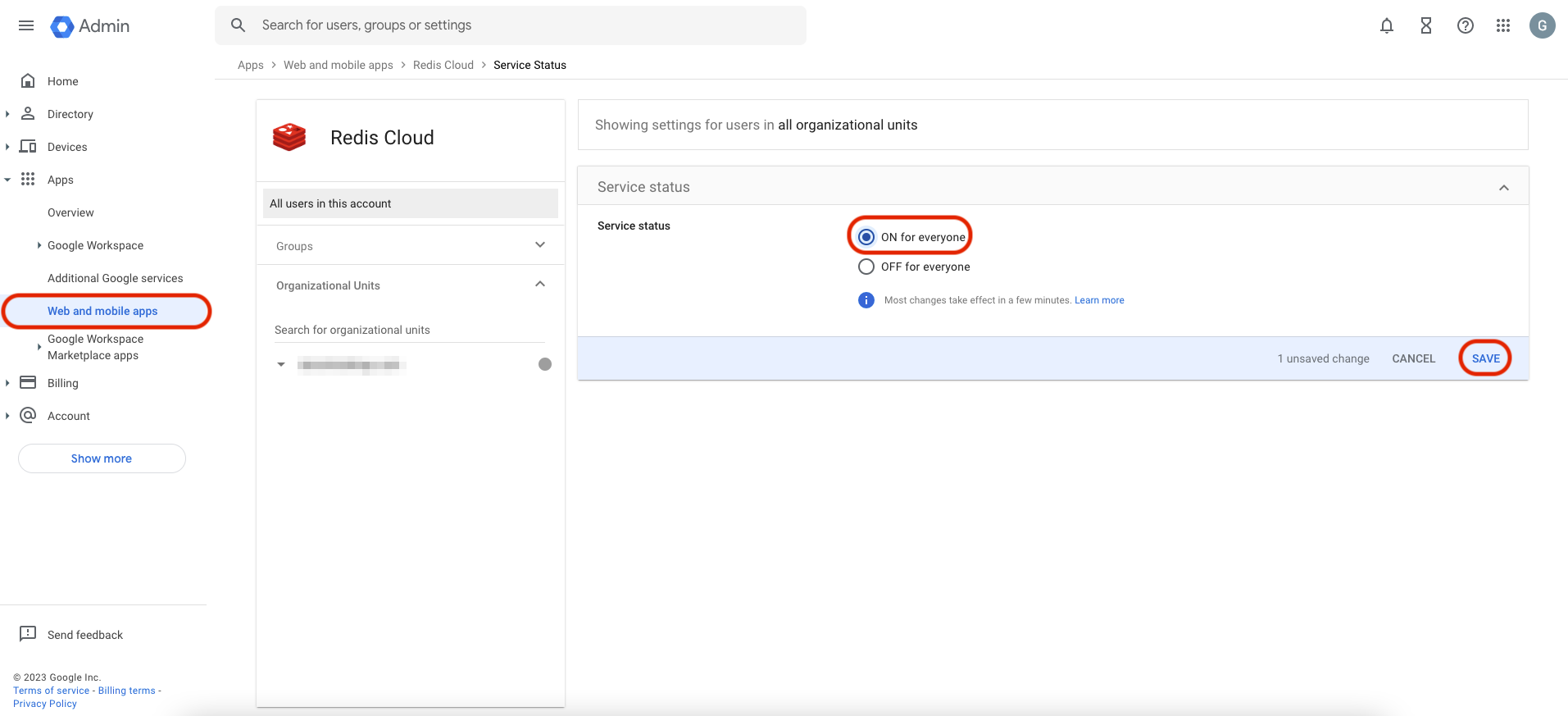 Next, we need to turn on the Redis Cloud service for all users, select Web and mobile apps -> Redis Cloud and then service status. Select ON for everyone. Once complete, select Save.