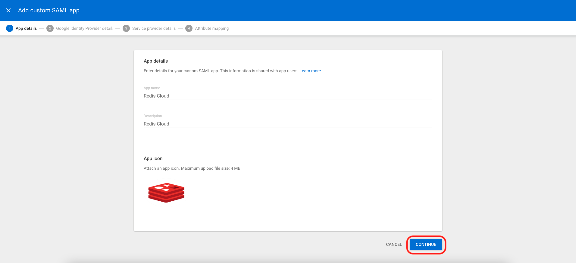 To begin, change the App name and Description to Redis Cloud. You can also choose an App icon for the application. We suggest you upload a Redis icon. Once complete, select Continue.