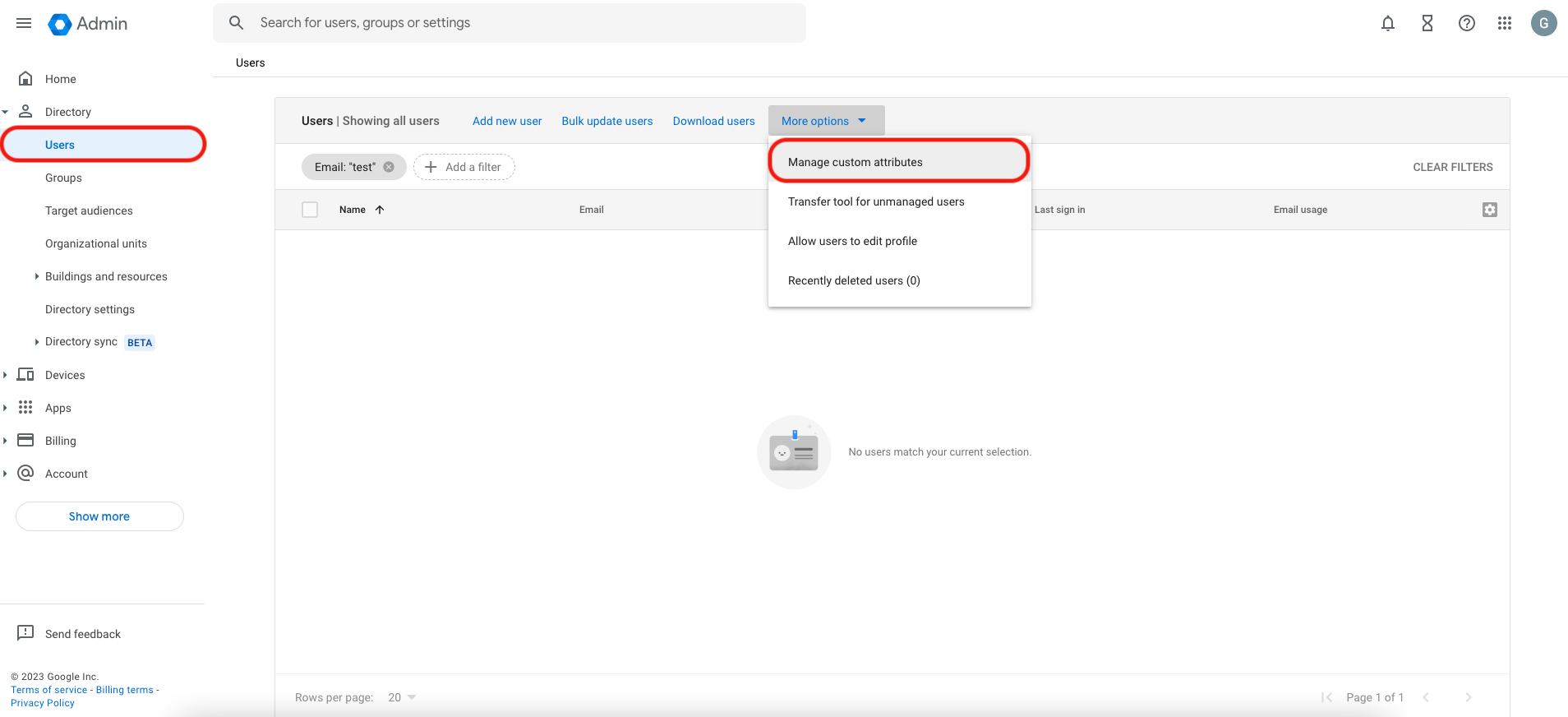 From the main menu in Google Workspace, select Directory then Users, and from the more options dropdown select Manage custom attributes.