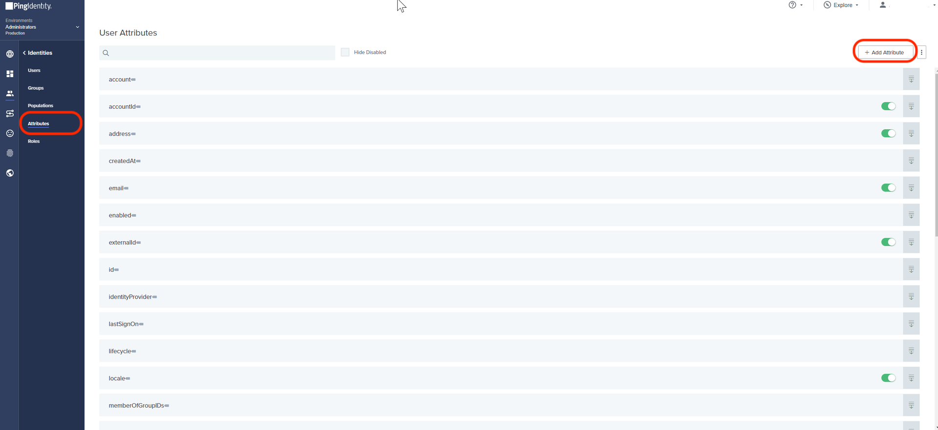 Log in into your Ping Identity account. Open Administrators > Identities > User Attributes and select Add Attribute.