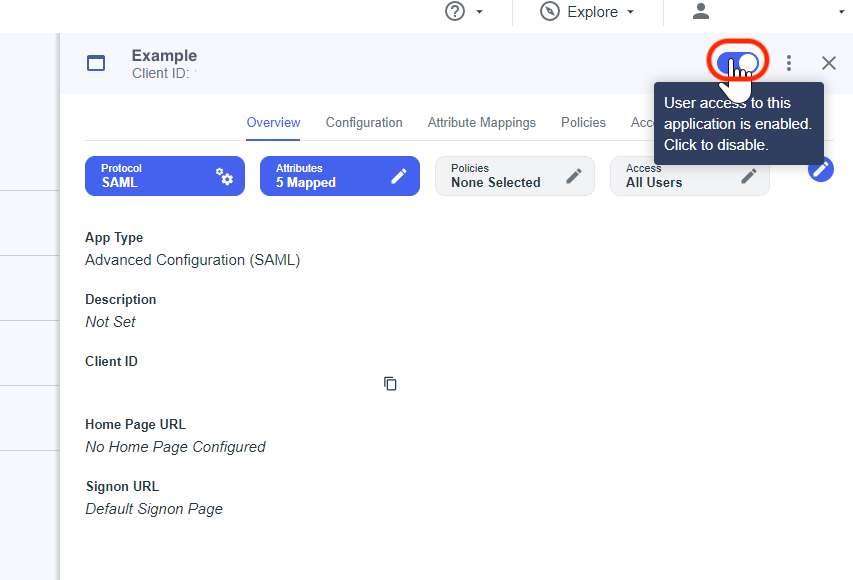 Go to Target Application URL and enter: https://{enviroment}/#/login/?idpId={idpId}, where idpId is the ID found in the Location field, after the last '/'
